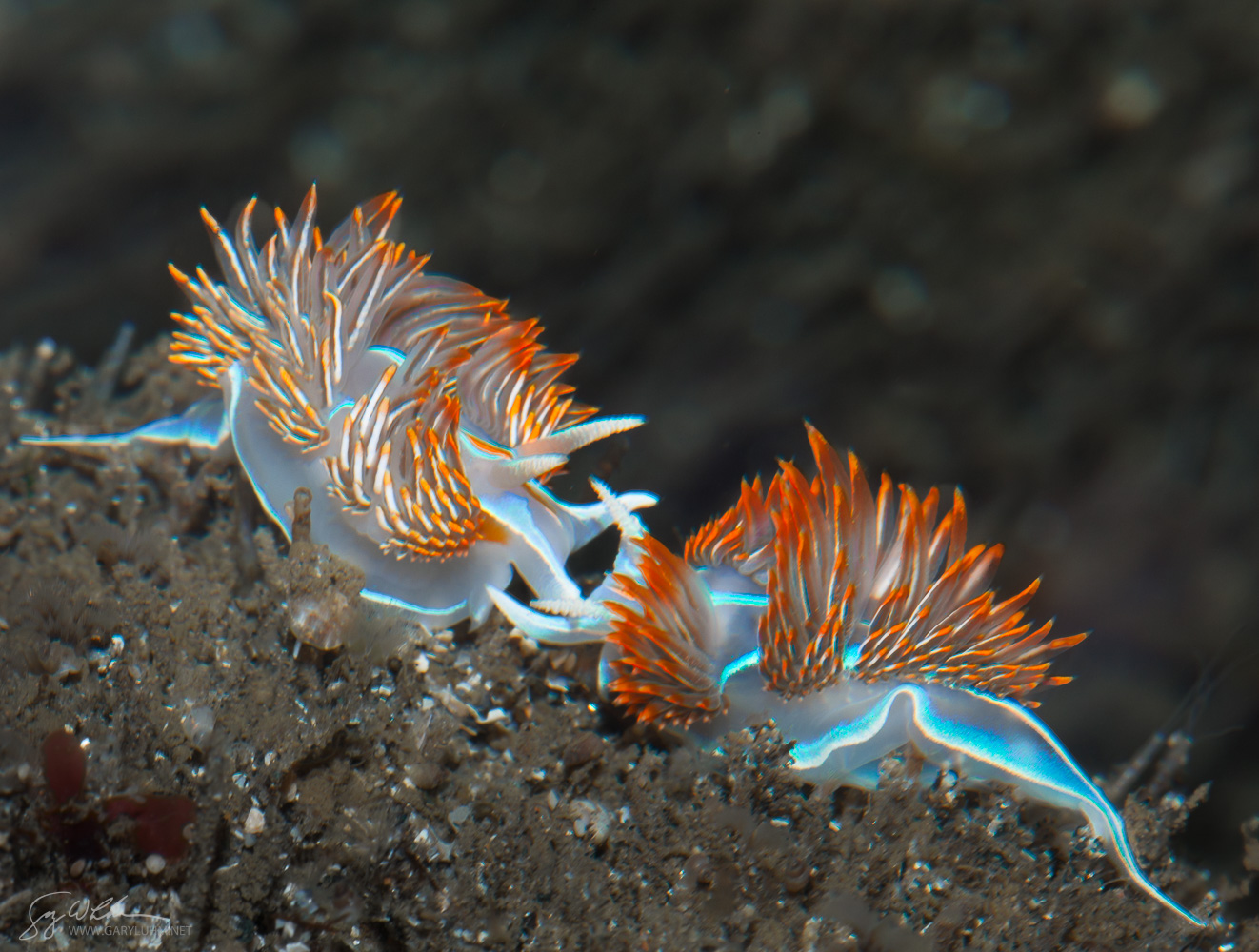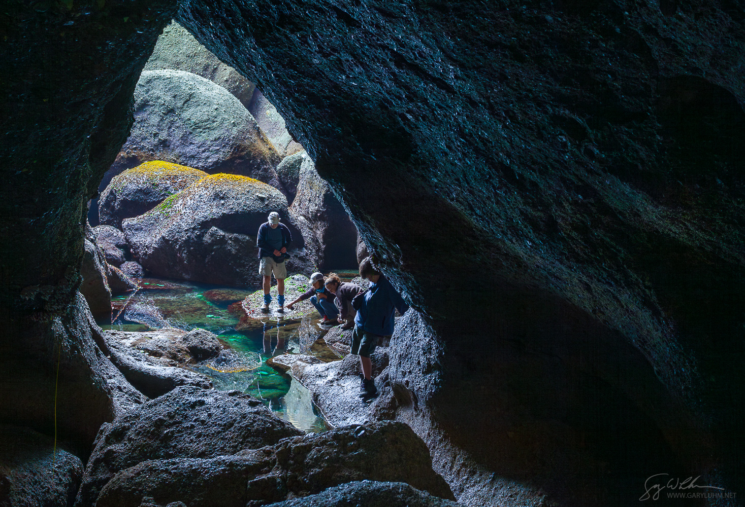 Canon 5D II, 34mm, ISO 800, 1/25s, f7.1.As the tide dropped that morning, I also I scored a planned shot of one of our impressive nudibranchs, Hermissenda Crassicornis. Getting two in a shot was a win. I used an external flash in the dim light. After a family out tide pooling joined in the cavern, I captured them inspecting an interior pool.