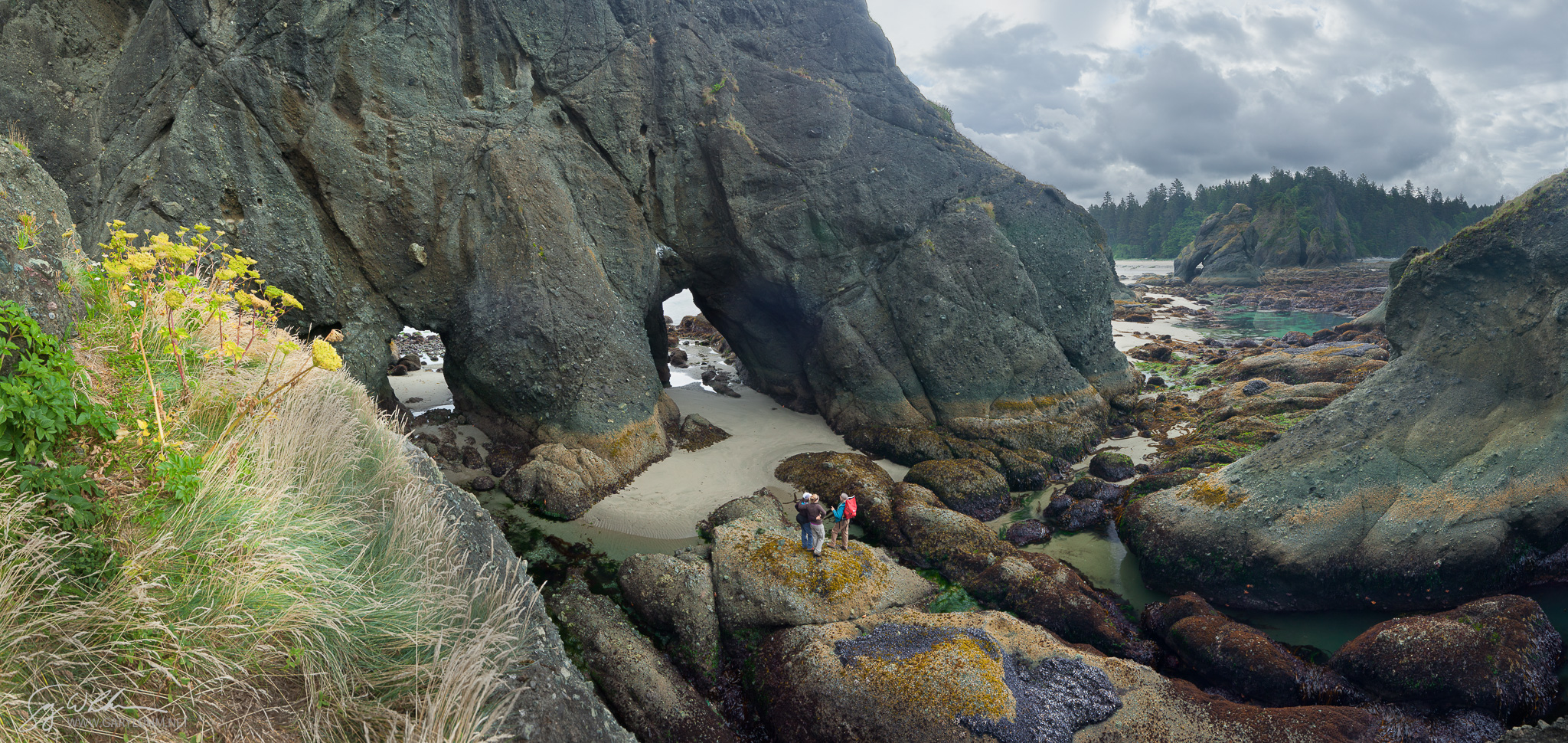 I belatedly realized on subsequent visits, the sea stacks at Point of the Arches offer so much more. The tide pooling is phenomenal, wildlife abounds and there are many mesmerizing scenic views. When computing power evolved and made panoramas practical, the panoply of sea stacks compels a seeing eye. Canon 5D II, 25mm, ISO 100, 1/5s, 1s, f11.In August, 2011, I kayaked in for a three-night stay. A panorama that jumped out for processing was this one (above), shot after I walked up the side of a sea stack. I love the subtle diagonals, the repeat archways, the peek-a-boo look toward the distant shore. When three women paused on a rock as I set-up, I included them. They add color, scale and interest. I thought this shot would be the best of the shoot. But on the other side of those archways two hours earlier—well ahead of the minus tide minimum—I shot a set I had never-processed.