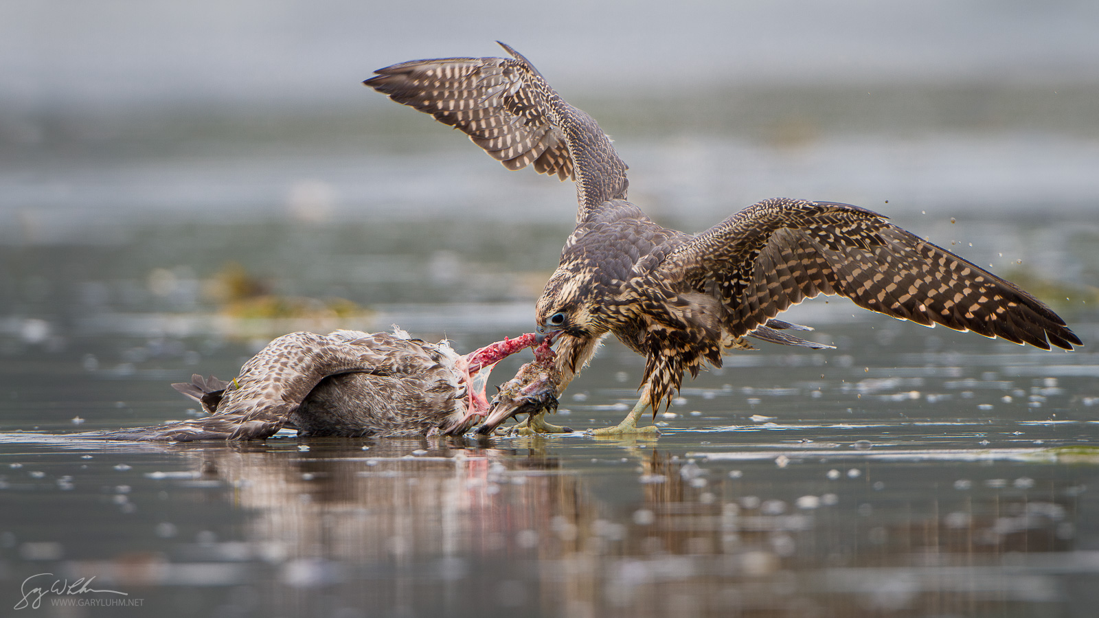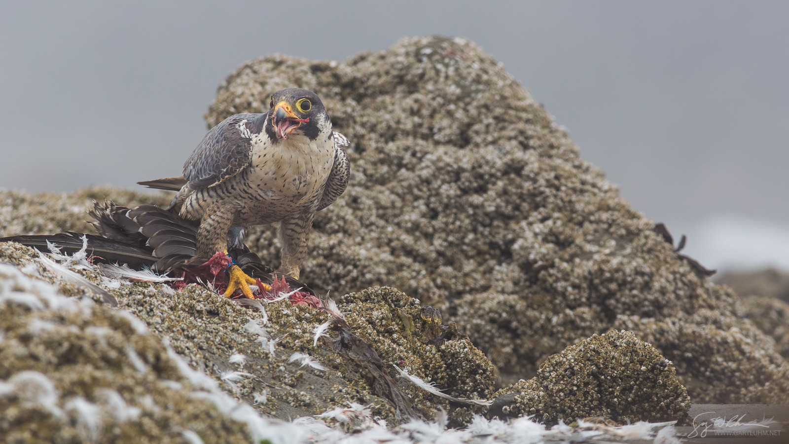Canon 5D III, 300mm, 1.4x, ISO 800, 1/1000s, f11Then in August, I joined a Washington Kayak Club trip paddling the Olympic Coast from La Push to Makah Bay. Our last camp, we pulled ashore in fog at Point of the Arches. As we were schlepping gear up the beach, I discovered a Peregrine Falcon on a kill. I dropped everything, grabbed camera, lay down on the beach and captured the moment.