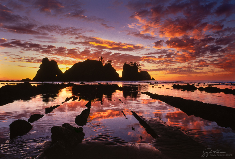 Canon 10S, 24mm lens, Velvia film.Point of the Arches in Olympic National Park became an obsession of mine soon after outdoor photography overtook competing interests. The image at left—from the late 90’s—captured a particular dream after numerous failures. A Labor Day ritual back then was paddling sea kayaks to Shi-Shi Beach and camping close to the Point. On this weekend, I postponed dinner after noting offshore clouds. The tide, partway out, exposed well the folded, sedimentary rock. The sun lingered—no offshore fog. I quickly found the spot to plant the tripod. The “shot” was pure old school: A single exposure on Velvia 50 film, 2-stop split ND filter, mirror-lock, 2-sec time delay on a with a 24mm TS-E (tilt/shift) lens. This was the vision that drove me (and many others) to the Point.