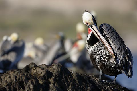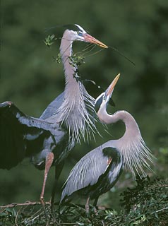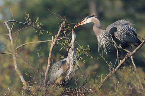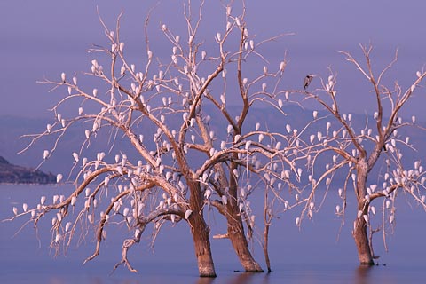 Cattle Egrets and a lone Great Blue Heron roost at the Salton Sea, CA.