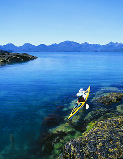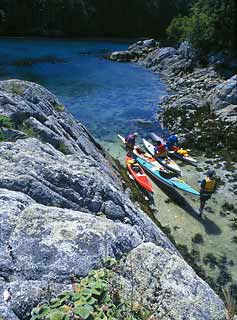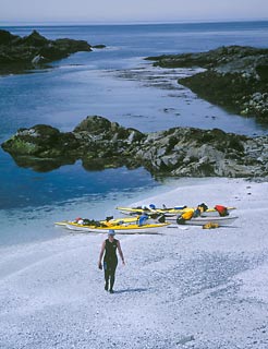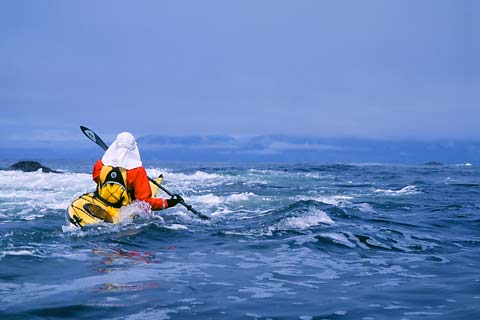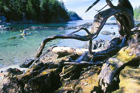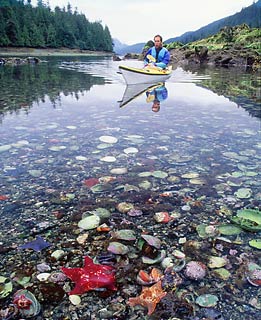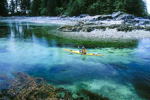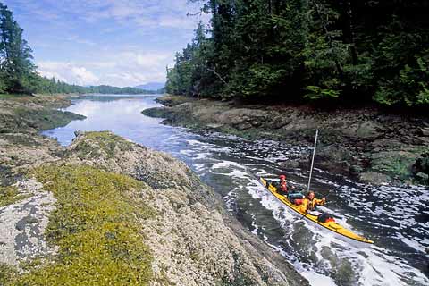 Un-named Bella Bella tide race Sea foam flows through a slot from an interior lagoon. Enchanting Dufferin Island, British Columbia.