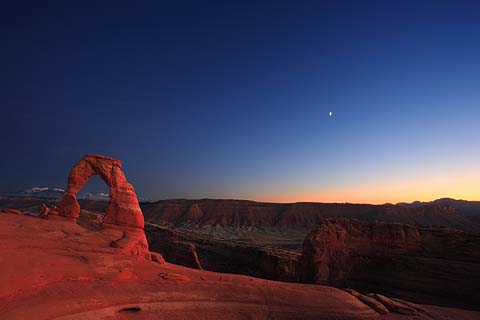 Delicate ArchFrom the classic overlook, a post sunset, late October scene with early snow on the La Sals and a crescent moon. Arches National Park.